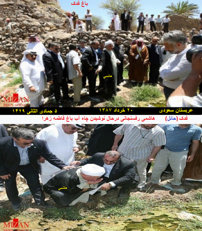 در سفر ۱۰ روزه خود به عربستان سعودی، در حالی که به مدینه سفر کردهبود، از وادی فاطمه یا همان منطقه تاریخی فدک نیز دیدن کرد و در حالی که اشک از چشمانش جاری بود، از چشمه فاطمه نوشید درحالیکه مسئول تشریفات سعودی خطاب به هاشمی میگوید:«آب نخورید، کثیفه» و درحالیکه آب درکف دستش بود گفت:« این آبِ باغِ حضرت زهرا است»نمیشودنخورد.