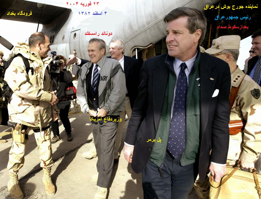 پل برمر(سفیرامریکادرعراق)همه کاره عراق-زمان اشغال-«احمد چلبی»به استقبالش می رود-درهنگام ورود به عراق(ایشان بجای «زلمی خلیلزاد» می آید)