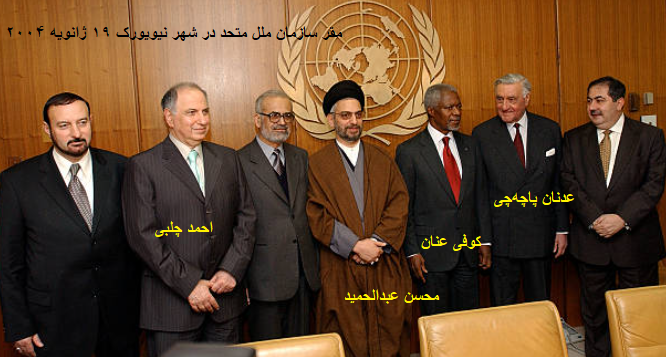بترتیب-ازراست:عدنان پاچه چی(وزیرامورخارجه سابق)،موفق الربیعی(شورای عالی امنیت عراق)، احمد چلبی(دبیرکل کنگره ملی عراق)،عادل عبدالمهدی(معاون رئیس جمهور-طالبانی)