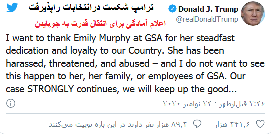 پرزیدنت ترامپ -روزقبل- از آغاز روند انتقال قدرت به رئیس جمهوری منتخب آمریکا خبر داد. رئیس جمهوری ایالات متحده در توئیتر خود نوشت «در راستای منافع کشور» او از اداره خدمات عمومی و همچنین دولت خود خواسته که پروتکلهای اولیه انتقال قدرت را انجام دهند.