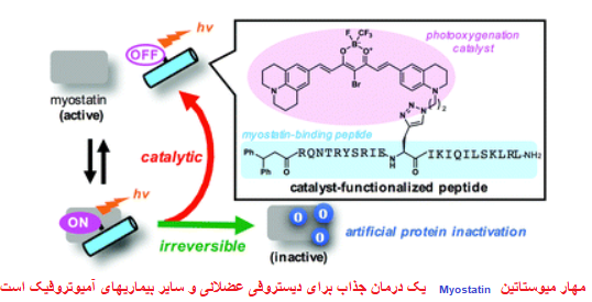 مهار میوستاتین یک درمان جذاب برای دیستروفی عضلانی( muscular dystrophy) و سایر بیماریهای آمیوتروفیک است. یک پپتید متصل به میوستاتین با مجهز بودن به یک کاتالیزور اکسیژناسیون عکس روشن و خاموش فعال شد. این پپتید باعث اکسیژن رسانی انتخابی میوستاتین در زیر نور مادون قرمز نزدیک می شود که منجر به غیرفعال شدن میوستاتین می شود. این پپتید چندین مرتبه اثر مهاری بیشتر از پپتید اصلی نشان می دهد.