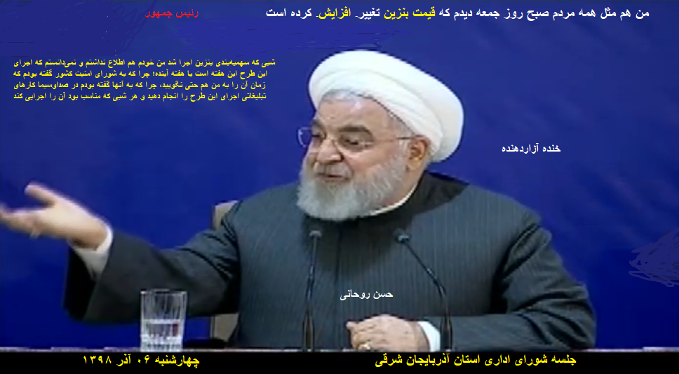 حجتالاسلام حسن روحانی رئیسجمهور عصر امروز چهارشنبه(۰۶ آذر ۱۳۹۸) در جلسه شورای اداری استان آذربایجان شرقی گفت: شبی که سهمیهبندی بنزین اجرا شد من خودم هم اطلاع نداشتم و نمیدانستم که اجرای این طرح این هفته است یا هفته آینده؛ چرا که به شورای امنیت کشور گفته بودم که زمان آن را به من هم حتی نگویید، چرا که به آنها گفته بودم در صداوسیما کارهای تبلیغاتی اجرای این طرح را انجام دهید و هر شبی که مناسب بود آن را اجرایی کند.