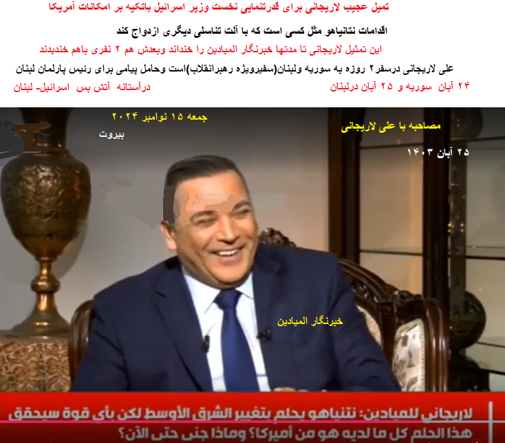 لاریجانی در مصاحبه با المیادین گفت: «نتانیاهو در همه چیز به قدرت آمریکاییها تکیه دارد و بدون آنها چیزی نیست. او مانند کسی است که میخواهد با ابزار دیگران ازدواج کند!»