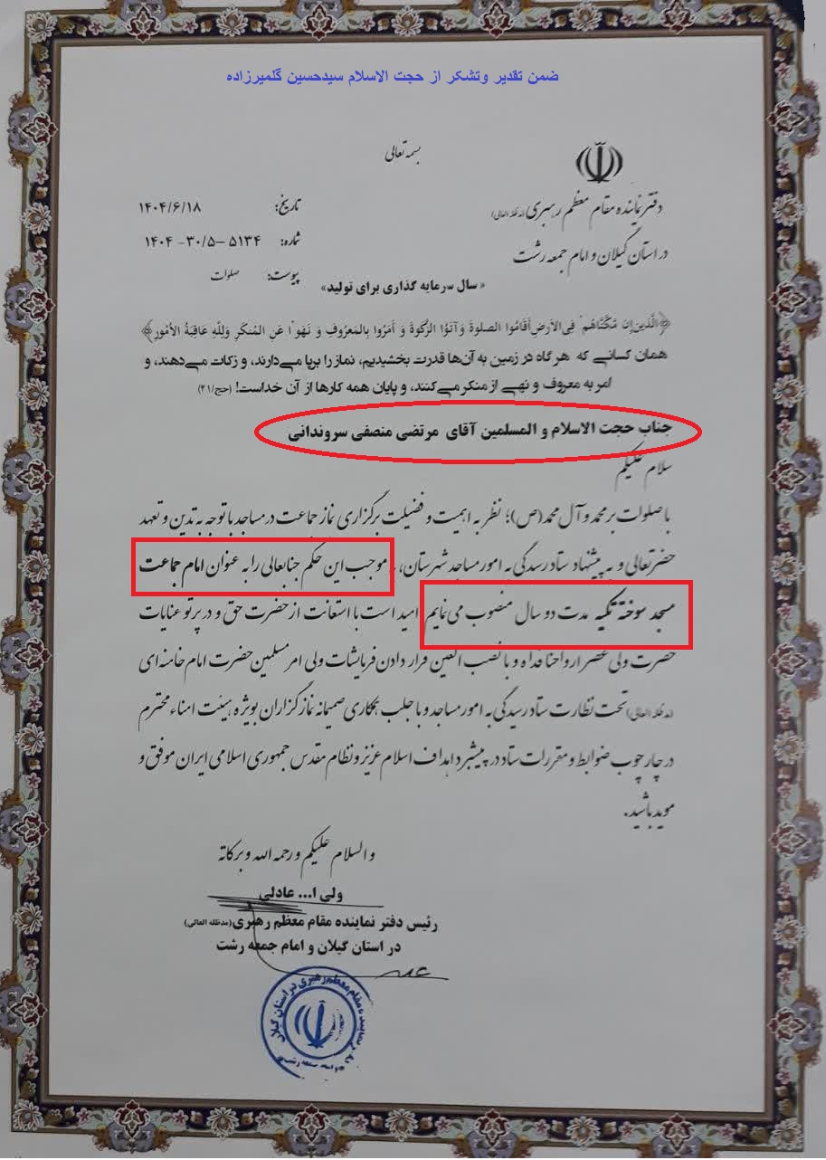 «حجت الاسلام سیدحسین گلمیرزاده» بعداز ۱۷ سال امامت، استعفاداد و «حجت الاسلام مرتضی منصفی سروندانی» معرفی شد.
