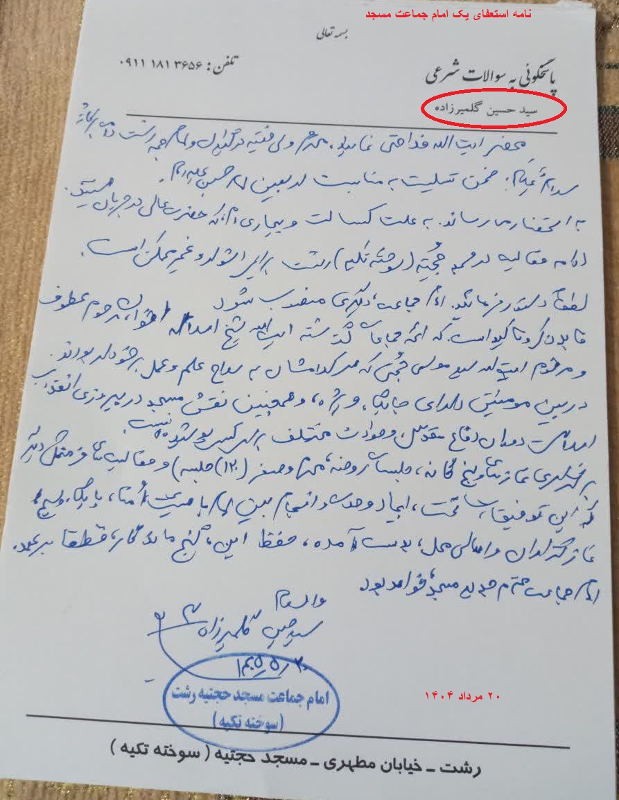 «نامه استعفای یک امام جماعت مسجد»