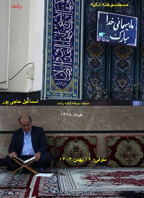توضیح مدیریت سایت-پیراسته فر:توضیح مدیریت سایت-پیراسته فر:یادی بکنیم از خادم بی ادعای مسجد سوخته تکیه:«اسماعیل حاجیپور»(رئیس هیئت امنای مسجد سوخته تکیه رشت)وی یکی از خوش نامان این شهر(رشت)بود وحامی مادی ومعنوی این مسجدبود،وی در دورههای اول، چهارم و پنجم منتخب مردم درشورای شهر رشت بود و «رئیس شورای شهررشت»،ایشان دستی در ورزش هم داشت، «مالک باشگاه داماش» بود که سرانجام در ۱۶ بهمن ۱۴۰۳ درگذشت.