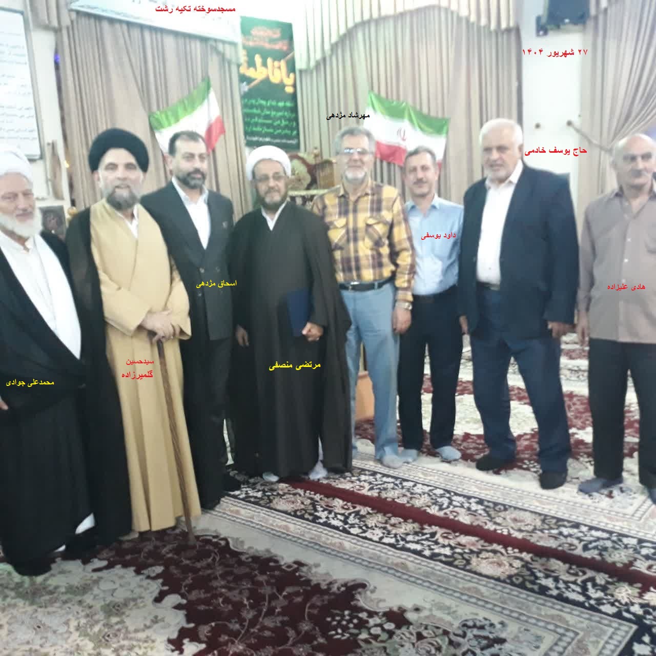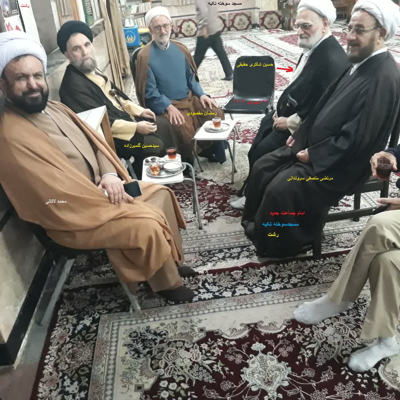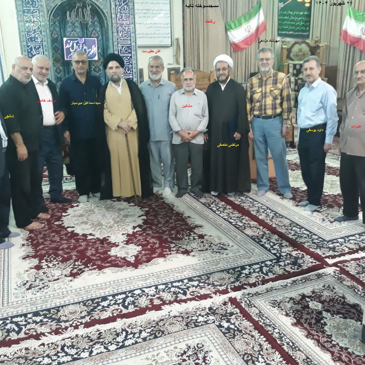 بترتیب ازراست:هادی علیزاده(معروف به سرهنگ)،داودیوسفی،مهرشادمژدهی،حجت الاسلام مرتضی منصفی(امام جماعت مسجدسوخته تکیه)،علی مشکین،علی حقپرست،حجت الاسلام سیدحسین گلمیرزاده(امام جماعت سابق مسجدسوخته تکیه رشت)،سیداسماعیل میرسیار،یوسف خادمی و شالچی.