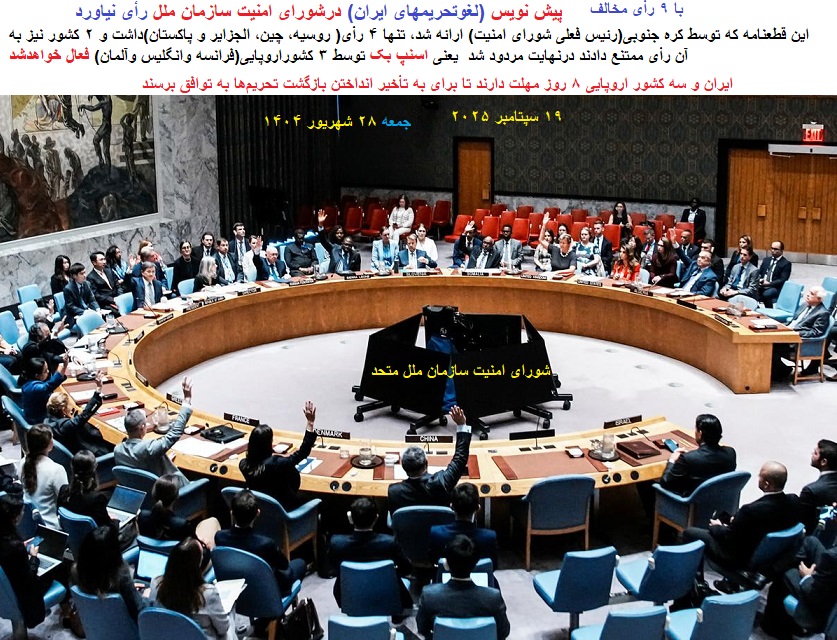 شورای امنیت سازمان ملل روز جمعه ۱۹ سپتامبر ۲۰۲۵ (۲۸ شهریور ۱۴۰۴) با ۹ رأی مخالف قطعنامهای که برای جلوگیری از اعمال مجدد تحریمها علیه ایران به دلیل برنامهٔ هستهایش ارائه شده بود، را رد کرد.