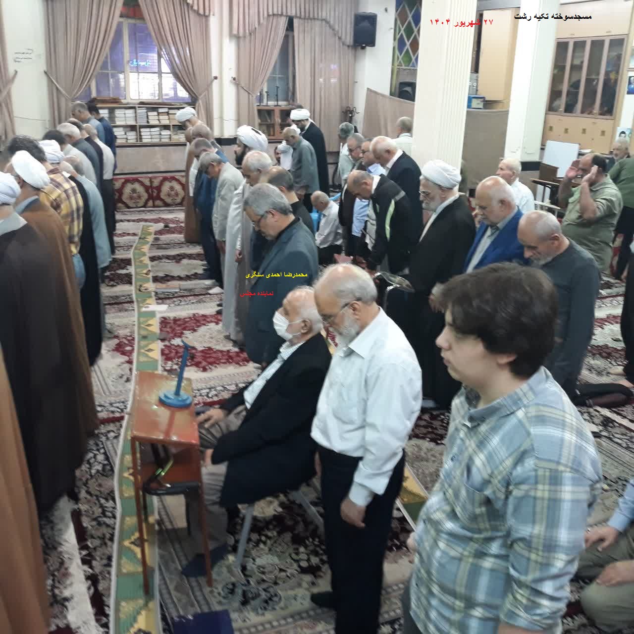 (مسجدسوخته تکیه) رشت ۲۷ شهریور ۱۴۰۴ »«محمدرضا احمدی سنگری»(نماینده رشت درمجلس شورای اسلامی)،ایستاده درحال اقامه نماز.(پشت سرِحجت الاسلام محمدعلی جوادی)