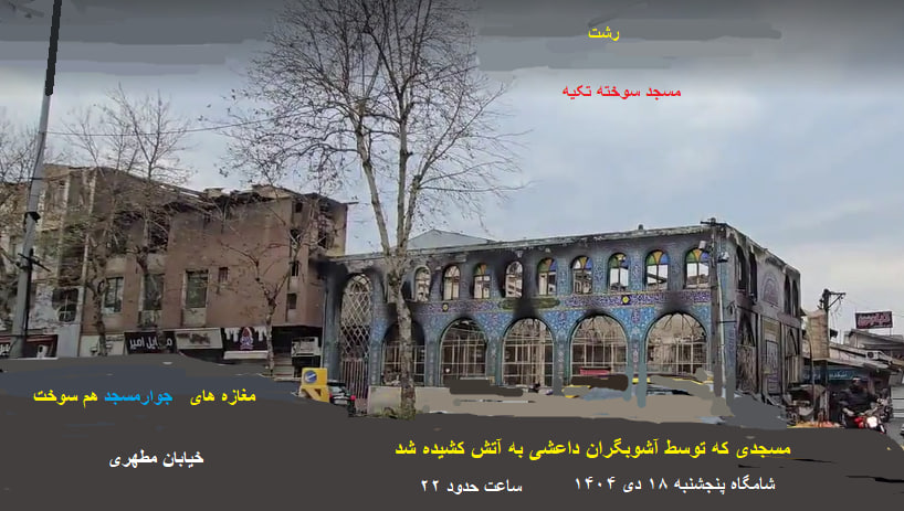 «مسجدسوخته تکیه رشت توسط اغتشاشگران به آتش کشیده شد»تخریب شد شامگاه پنجشنبه ۱۸ دی ۱۴۰۴ به آتش کشیده شد.