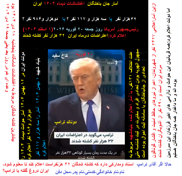 رئیسجمهور آمریکا روز جمعه ۲۰ فوریه ۲۰۲۶(۱ اسفند ۱۴۰۴) اعلام کرد که در اعتراضات دیماه ایران «در مدتی کوتاه» ۳۲ هزار نفر کشته شدند.