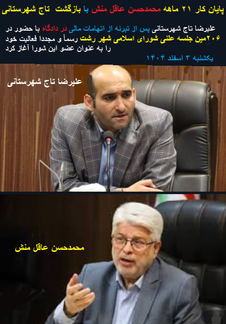 «پایان کارعاقل منش در شورای شهر رشت»:«آغاز بکار علیرضا تاج شهرستانی در ۲۰۶مین جلسه شورای شهر رشت».