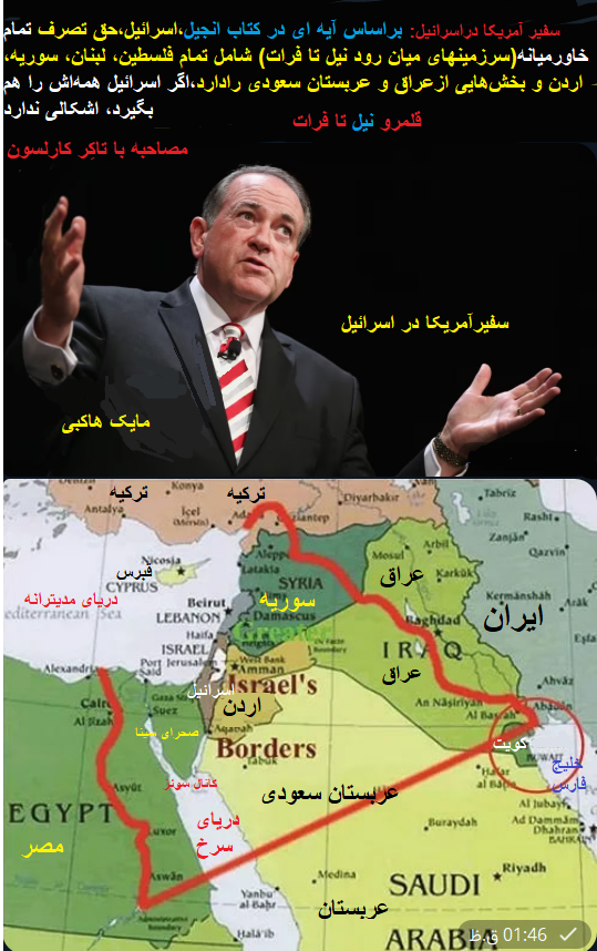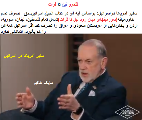 «مایک هاکبی»( درمصاحبه با تاکِر کارلسون):اسرائیل(براساس کتاب انجیل)حق تصرف تمام خاورمیانه(فلسطین، لبنان، سوریه، اردن،عراق وعربستان)«میان رود نیل در نیل تا فرات»