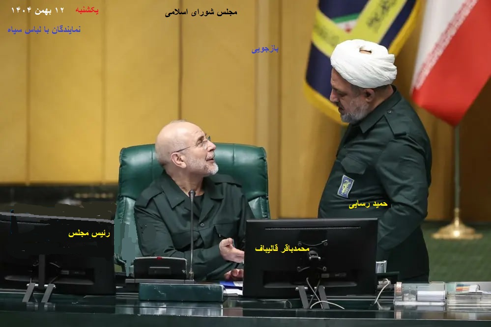 «حجت الاسلام حمیدرسایی»(بالا سر رئیس مجلس،قالیباف)«با لباس سپاه پاسداران»صحن علنی مجلس شورای اسلامی ۱۲ بهمن ۱۴۰۴