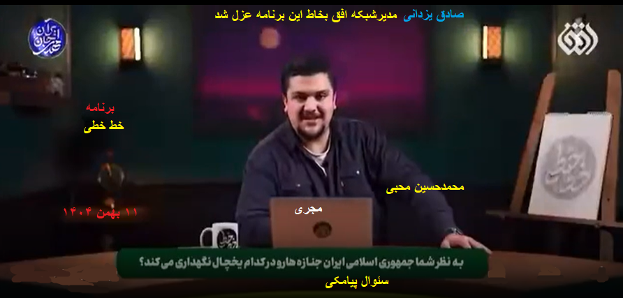 سئوال ۴گزینه مجری برنامه(خط خطی) ۱۱ بهمن ۱۴۰۴ شبکه افق(محمدحسین محبی) درمورد نگهداری جنازه های کشته شدگان اغتشاشات...کدام یخچال..مدیرشبکه افق(صادق یزدانی)برکنارشد.