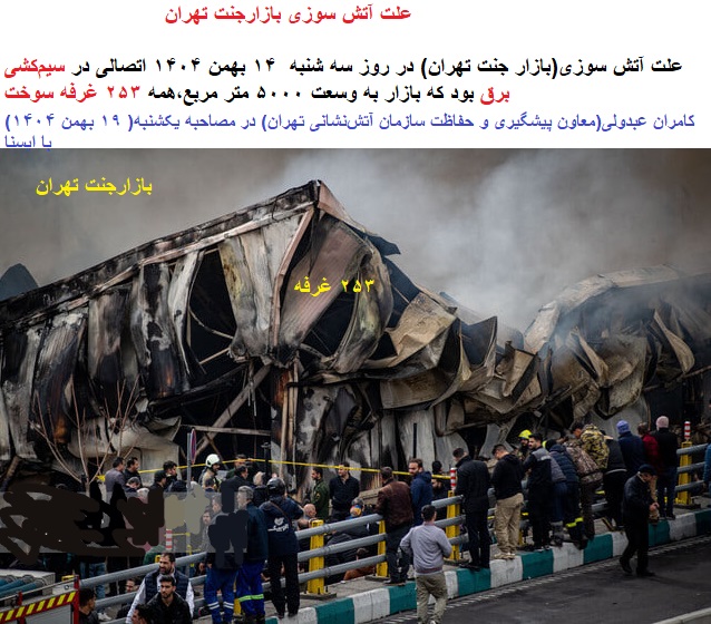 «علت آتش سوزی(بازار جنت تهران)» ۱۴ بهمن ۱۴۰۴«اتصالی در سیمکشی برق» بود که بازار به وسعت ۵۰۰۰ متر مربع،همه ۲۵۳ غرفه سوخت.